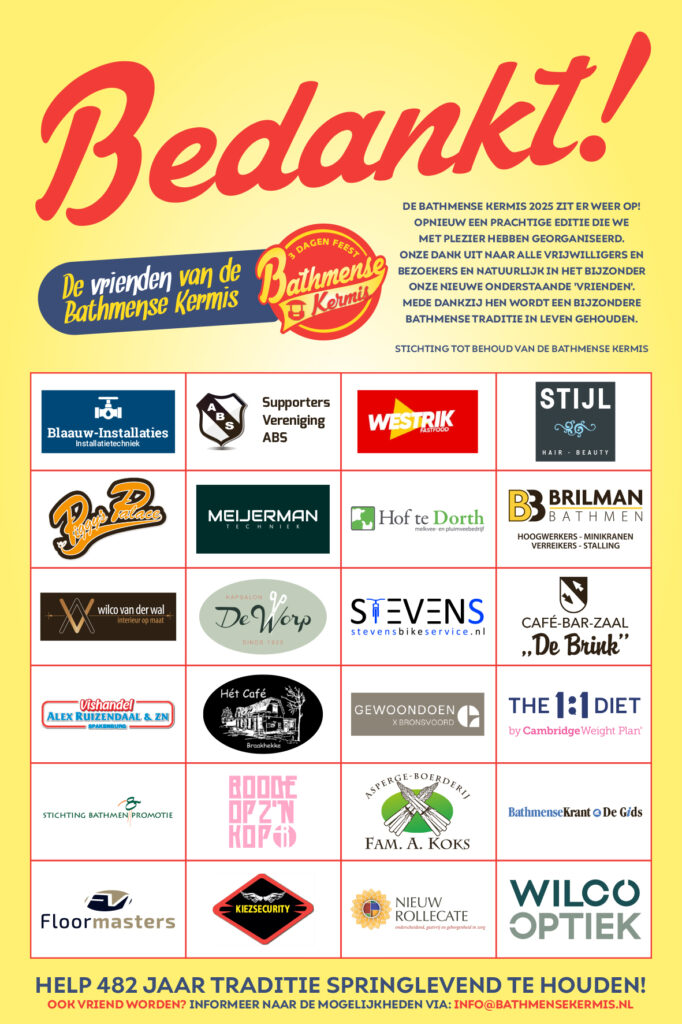De laatste maandag van de Bathmense Kermis moet in september vallen. En dat is in 2026 maandag 28 september. Op zaterdag 26 september gaat voor de 483-ste keer de Bathmense Kermis van start. De Stichting tot Behoud van de Bathmense Kermis haalt weer alles uit kast om er drie spetterende kermisdagen van te maken. De Stichting presenteert ook dit jaar een programma voor jong en oud waarbij plezier voorop staat! Het uitgangspunt daarbij blijft om het bijzondere karakter van de kermis in Bathmen te koesteren, maar ook om nieuwe elementen toe te voegen; kortom: vernieuwen, met respect voor het verleden. Zodra het volledige programma bekend is zal het worden gepubliceerd op www.bathmensekermis.nl
